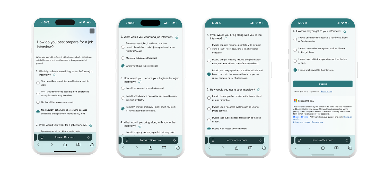Execution Idea: Survey about preparing for a job interview that blocks selection of preferred choices to show people that some don't have the choice.