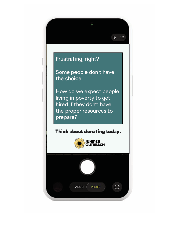 This campaign was created for a local non-profit organization in Worcester, Massachusetts that addresses impoverished communities in the city. Juniper Outreach Foundation has opened seven food, clothing, and hygiene product pantries at inter-city schools in Worcester; giving students the opportunity to take what they need for themselves or their families to help them stay fed, clean, and warm. While researching for this brief, I came across the insight that many impoverished individuals have a difficult time getting hired to get back on their feet as they do not have access to proper clothing attire or proper hygiene products. With this idea, a faulty survey within linkedin would allow users to fill out a survey asking about how they would prepare for an interview, and through that be able to see how others are not able to do the same. As users navigate the survey they are blocked from choosing the preferable answers and forced to select only the worst options, which may be the only options for someone else. Ending with a call to action, this emerging technology not only makes users stop to think about how difficult it really can be for the homeless or impoverished to just "get a job," but also encourages them to get involved and help out. I wanted this campaign to show just how serious this issue is in the Worcester community and how many effects it has on people's lives, as well as how much of a difference they can make by donating to Juniper.
