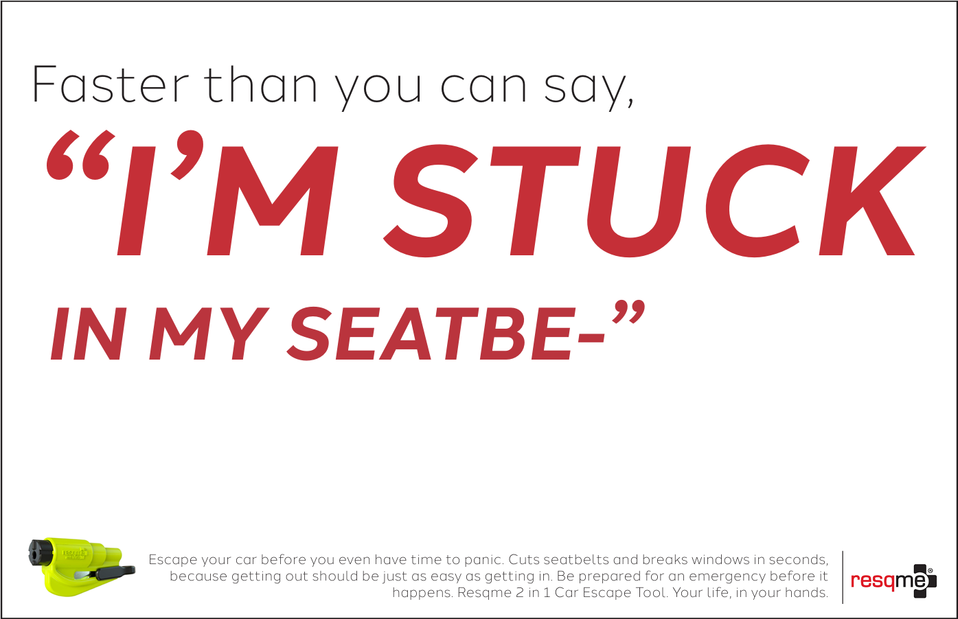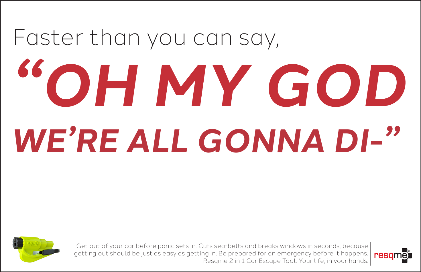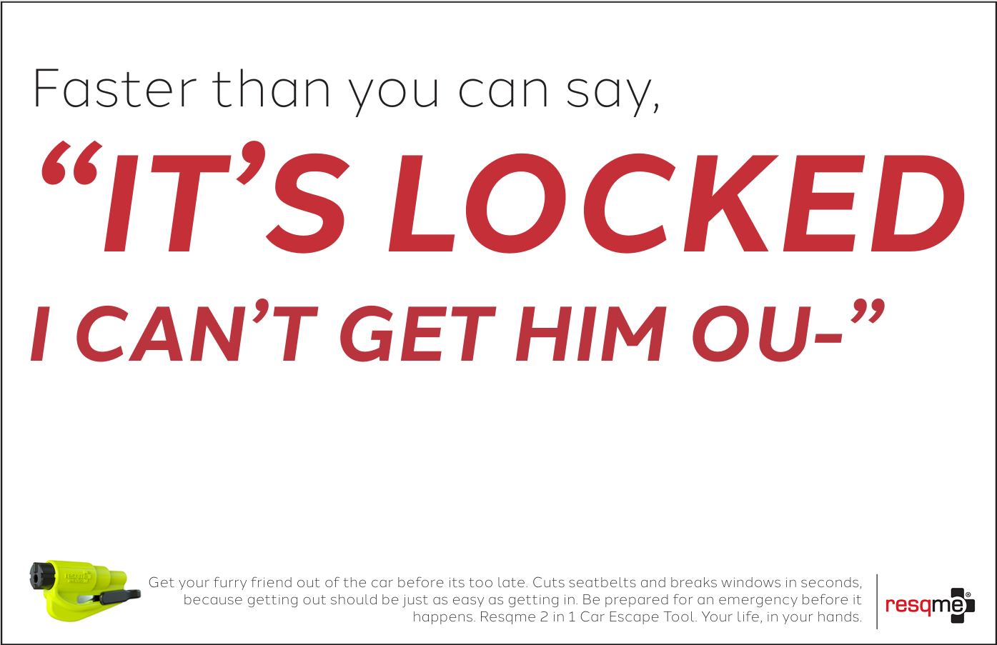 This campaign was designed to highlight the sheer panic that one may feel should they come to be trapped in a vehicle in the case of an emergency. I also wanted to denote one ad to addressing the alternate use of Resqme, which is to get a person or pet OUT of a car if they are accidentally trapped inside. Although these situations are very rare and may seem like something that would never happen, it is always better to prepare and be safe rather than sorry. The bold type is used as a call to action for people to reconsider buying this tool to have on hand, because you really never know when that emergency could strike. Resqme is small and compact and a worthy purchase for any drivers to feel more secure, and that is exactly what this campaign tries to highlight. Speed, ease, and security.