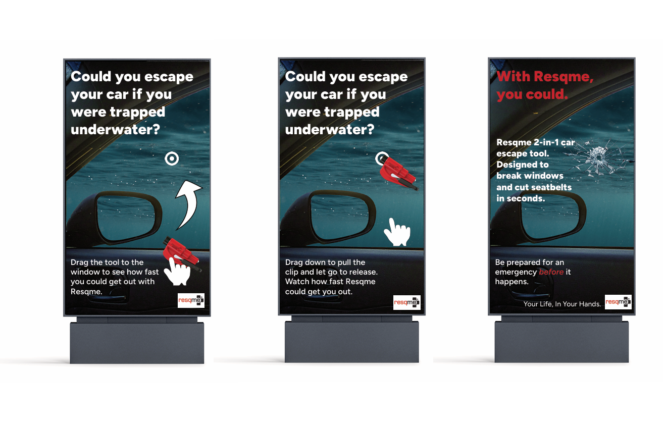 Execution Idea: Sentences of panic/distress cut off by Resqme tool helping people escape their car or get someone out in times of emergency.